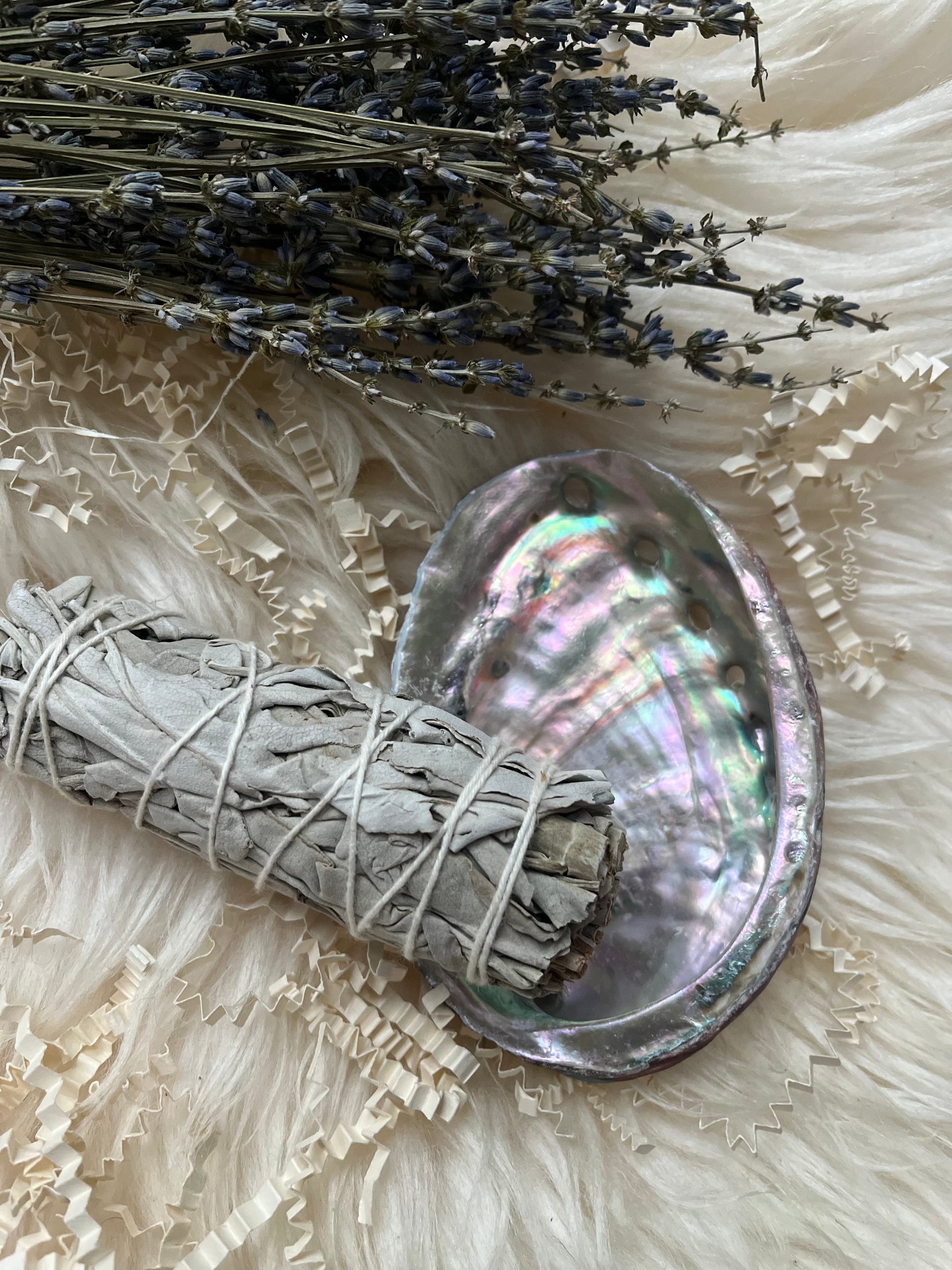 Contents: Ecuadorean white sage smudge stick, abalone shell, scented tealight